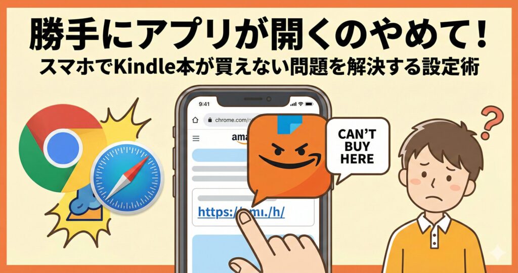 Kindle本(電子書籍)を買おうと思って、スマホでAmazonのページを開いた時、勝手にAmazonショッピングアプリが起動してしまって、イライラしたことはありませんか? しかも、アプリが開いたと思ったら、 「このアプリ内では本を購入できません」 という表... -