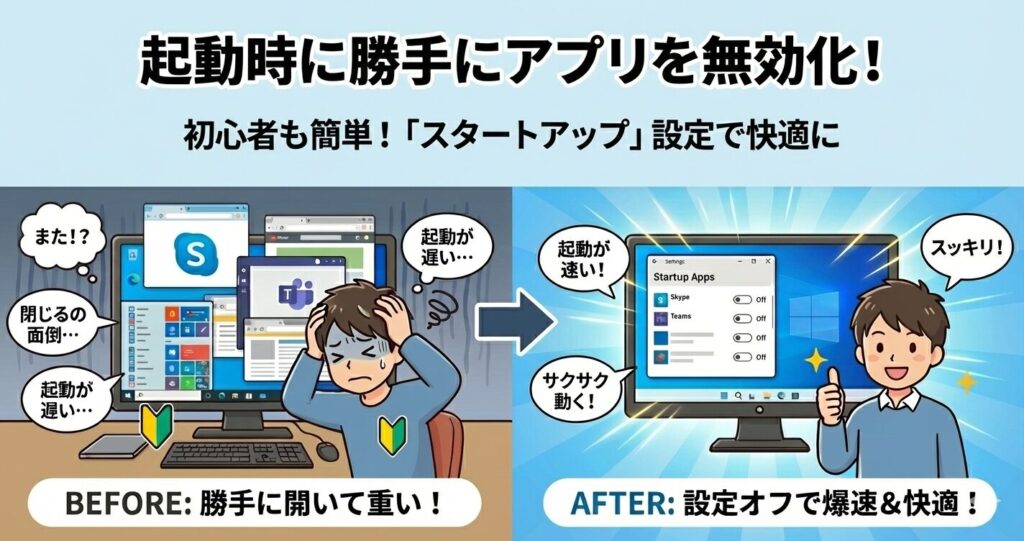 【PC高速化】Windows起動時に勝手にアプリが開く!「スタートアップ」を無効にしてパソコンを軽くする方法