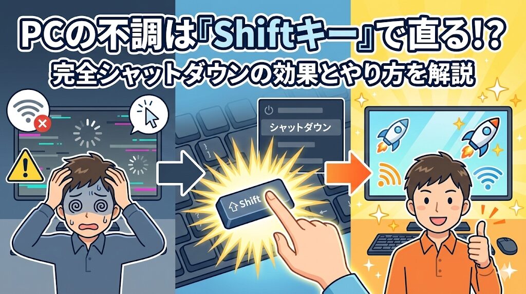今回は、パソコンの不調を一発で解決する方法、「Shiftキーを押しながらシャットダウン(完全シャットダウン)」について、その効果とやり方を解説します。