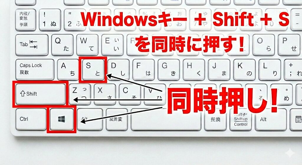 わざわざアプリを選択して起動する必要はありません。キーボードの 「Windowsキー」+「Shift」+「S」 を3つ同時に押してください。