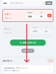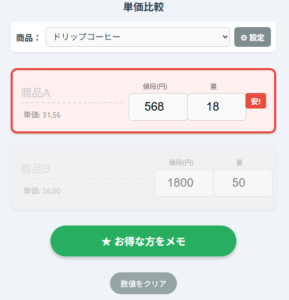 比較が終わったら、「★ お得な方をメモ」ボタンを押してください。 結果が保存され、次回の買い物の際にとして参考にできます。